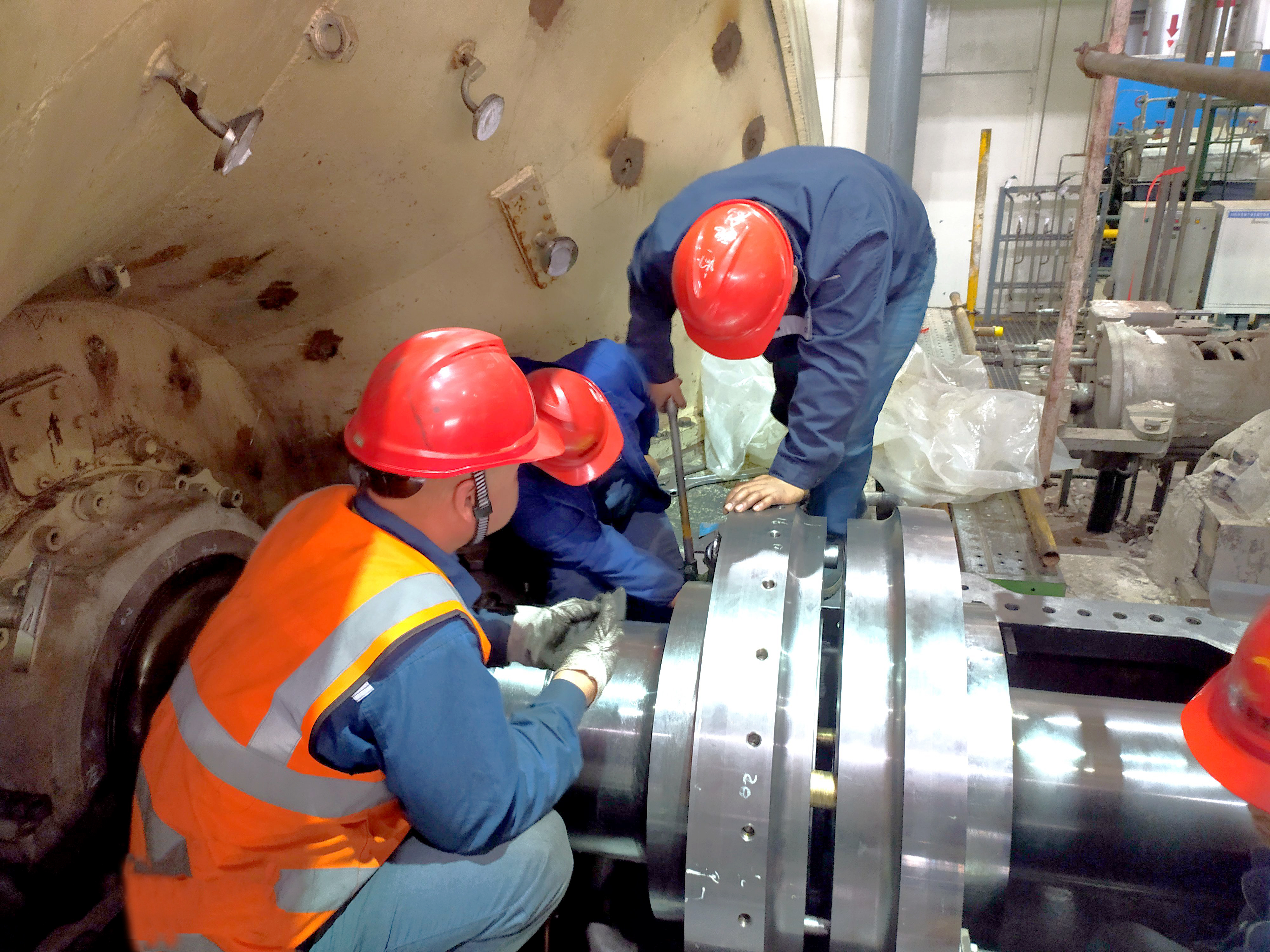 不远处,另一组人员正围着高、低压转子对轮,在三块百分表的“协助”下,为这两个“庞然大物”找中心,这对一群男子汉来说,无异于要使出“绣花功夫”。测量时,工作人员需要根据选定的0°、90°、180°、270°四个基准点,不时和行车司机上下沟通,盘动转子调整对轮位置,必要时还需要借助销棒手动盘车,一点一点定位,并测算出张口、圆周偏差等参数,然后通过调节轴承座的位置对对轮中心进行校正,这样“泡”在作业台上的来回重复调整,大家经常一干就是一个多小时。