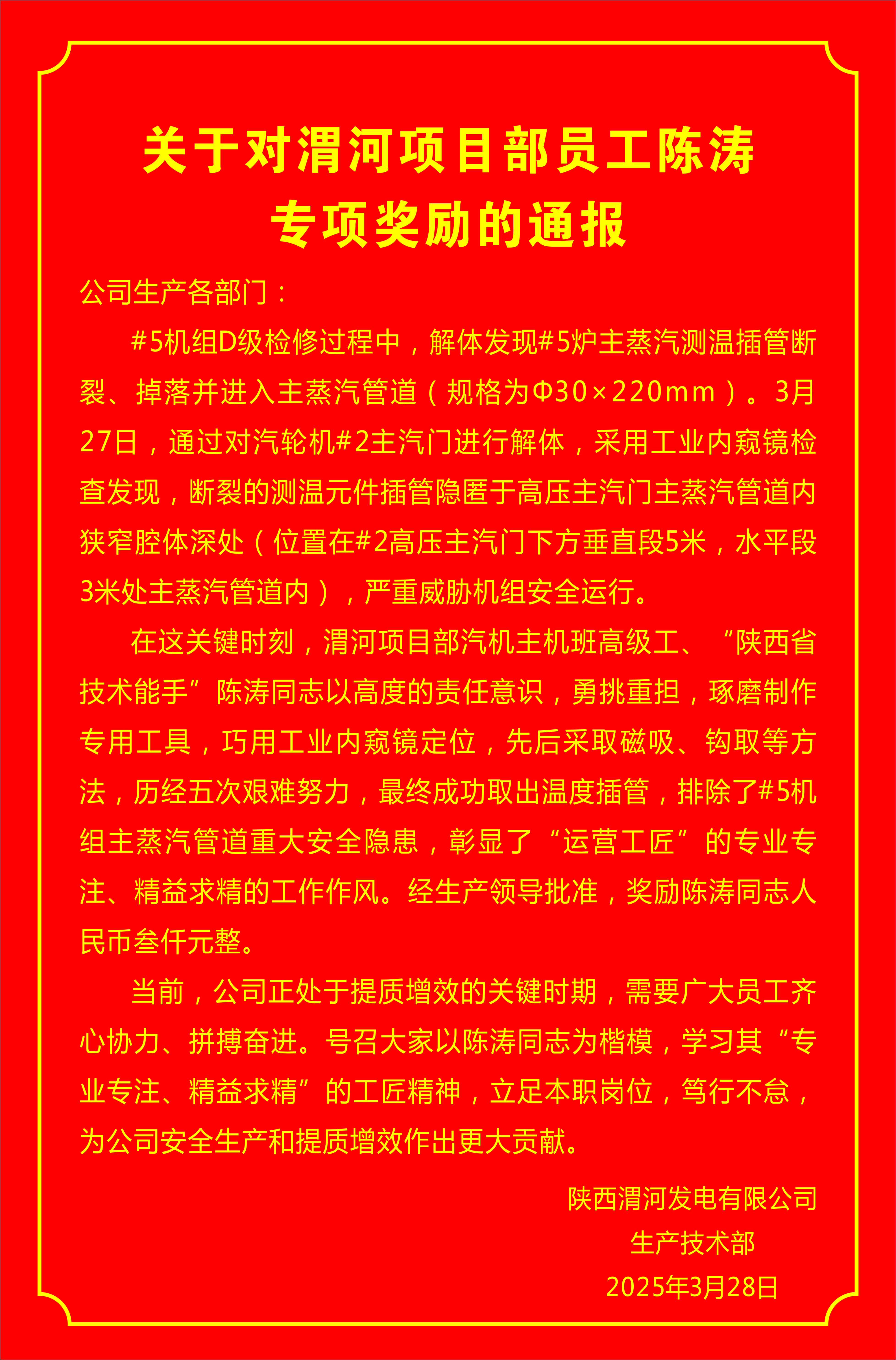 近日,一张粘贴在渭河发电生产楼前的嘉奖专项通报吸引着过往员工的目光,成为大家纷纷热议的焦点。