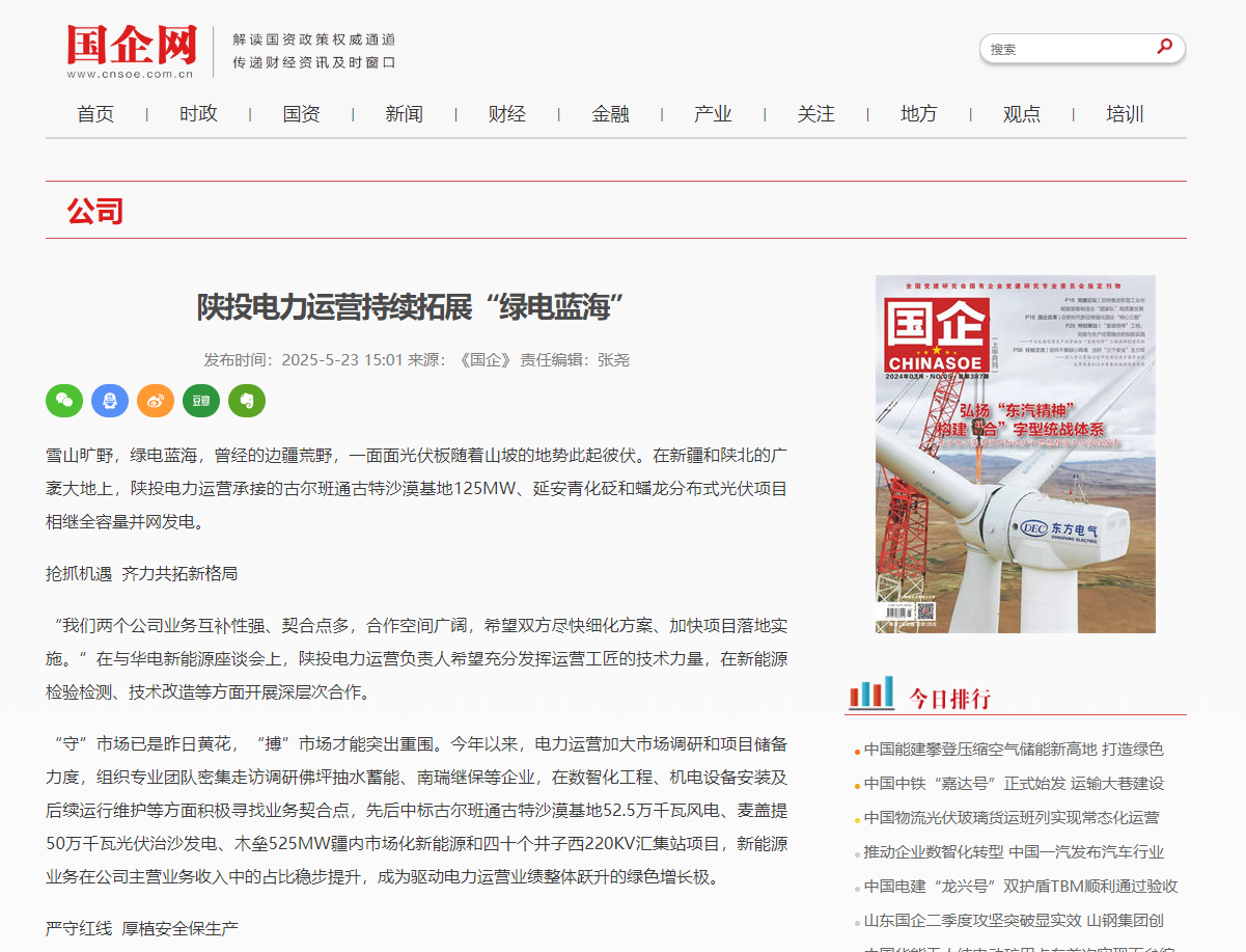 “守”市场已是昨日黄花,“搏”市场才能突出重围。今年以来,电力运营加大市场调研和项目储备力度,组织专业团队密集走访调研佛坪抽水蓄能、南瑞继保等企业,在数智化工程、机电设备安装及后续运行维护等方面积极寻找业务契合点,先后中标古尔班通古特沙漠基地52.5万千瓦风电、麦盖提50万千瓦光伏治沙发电、木垒525MW疆内市场化新能源和四十个井子西220KV汇集站项目,新能源业务在公司主营业务收入中的占比稳步提升,成为驱动电力运营业绩整体跃升的绿色增长极。